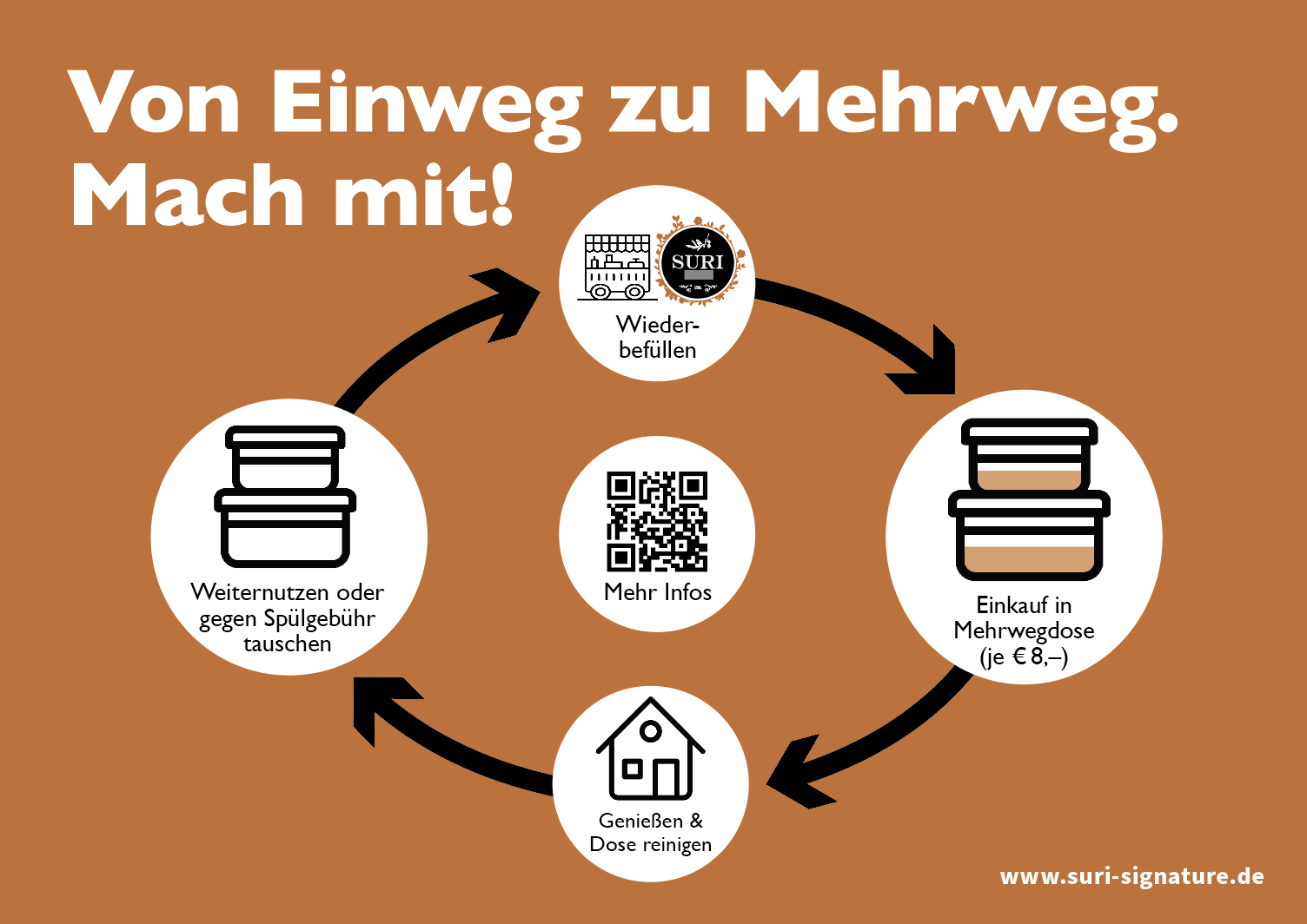 "Suri Signature" möchte die Gesellschaft zu nachhaltigerem Konsum und zur Umstellung auf Wiederverwendungssysteme bewegen. Gemeinsam mit Vertretern aus Kommunen, Umweltorganisationen, regionalen Netzwerken, Behörden, lokalen Stakeholdern, Innovationszentren, Forschungseinrichtungen sowie Akteuren aus der Lebensmittelindustrie und Gastronomie entwickeln wir strategische Lösungen.