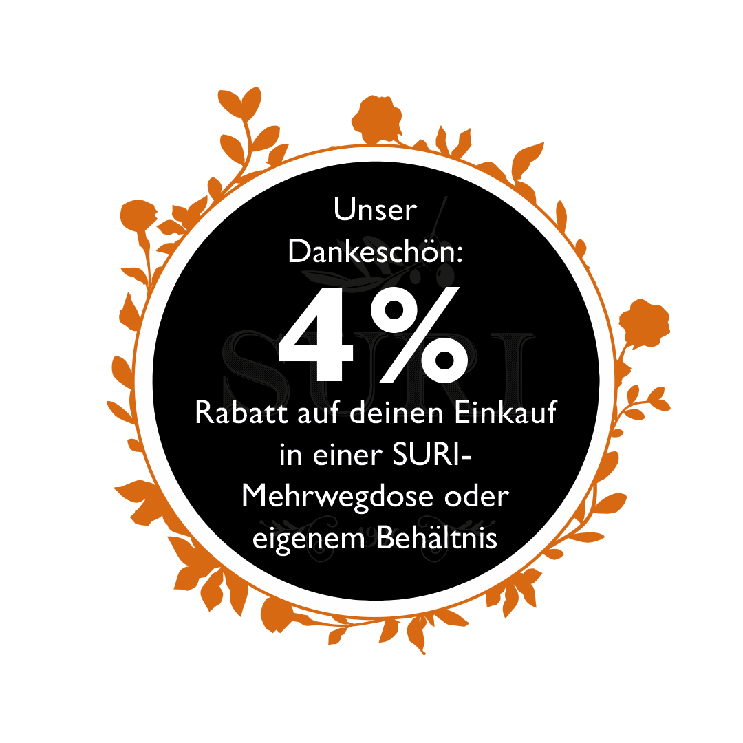 Übrigens: Für jeden Einkauf im eigenen Behälter oder auch in unseren Mehrwegdosen bekommst du 4% Rabatt auf den Inhalt.